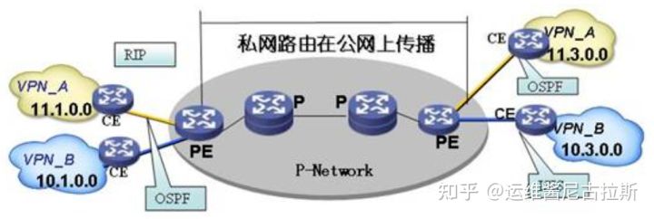 Peer-to-Peer VPN的主要特点是服务提供商的PE设备直接参与CE设备的路由交换。该VPN模型的实现依据是:如果去往某一特定网络的路由未被安装在路由器的转发表中,在那台路由器上,该网络不可达。实施Peer-to-Peer VPN的前提是所有CE端的地址是全局唯一的!