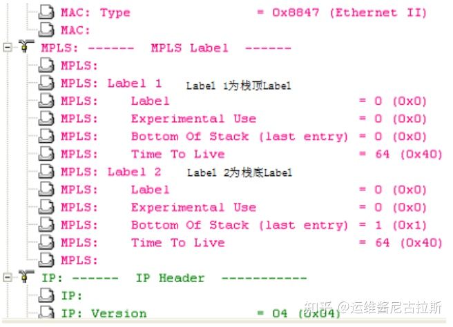 需要注意的是一个MPLS报文可以有多个Label,靠近二层头的Label为栈顶Label,靠近IP报文的Label为栈底Label,LSR执行Label交换时总是基于栈顶Label。有多个Label时,每个Label都包括以上完整的32bit,并不是其它的Label只包括20bit的Label值,如下图所示: