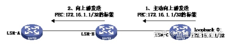 如图所示,对于某FEC(图示中的IPv4前缀)来说,C是B的下游路由器,A是B的上游路由器。