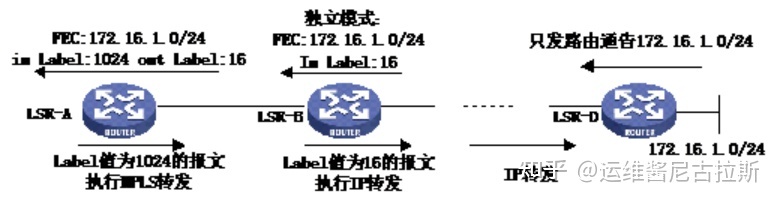 LSR如果工作在独立控制方式下,如果标签分发方式是DU,即使在没有获得下游标签的情况下也会直接向上游分发标签。在标签控制的方式上显得很“独立”,不依赖下游LSR;如果标签分发方式是DOD,发送标签请求的LSR的直连上游LSR会直接回应标签,而不必等待来自最终下游的标签。