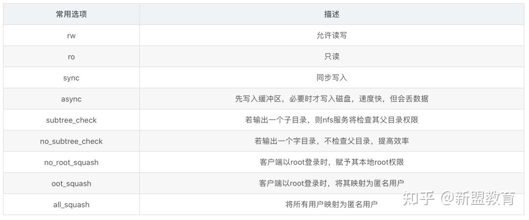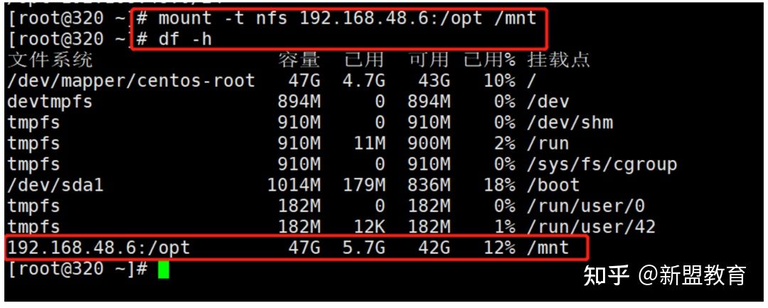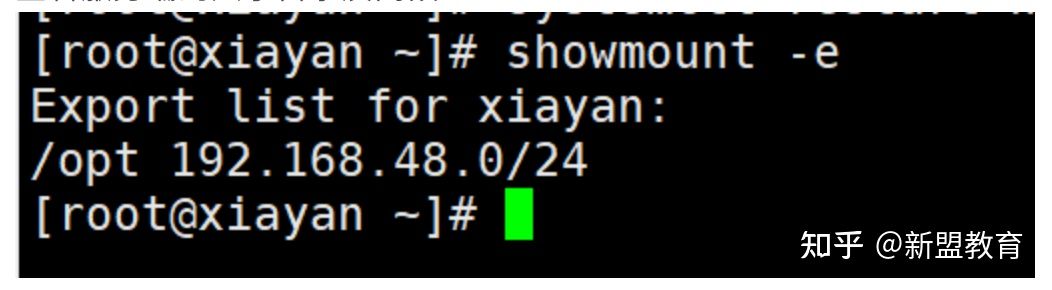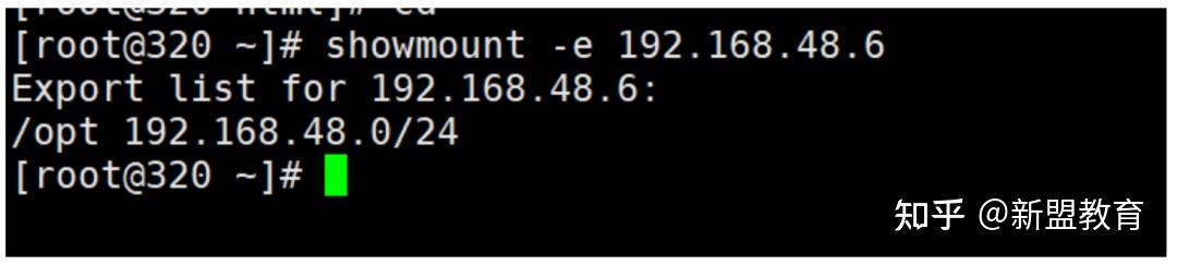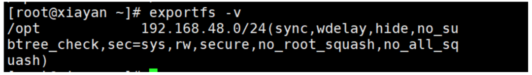 1.检查并安装软件 rpm -q rpcbind nfs-utils yum install -y rpcbind nfs-utils 2.创建共享目录 vim /etc/exports //NFS的配置文件,默认文件内容为空(无任何共享) /opt 192.168.48.0/24(rw,sync,no_root_squash) //设置/opt为共享目录,允许192.168.48.0网段的IP地址主机访问 3.启动服务 systemctl start rpcbind //一定要先开启rpcbind服务 systemctl start nfs //如服务已启动,更改完配置信息后需要重启服务
