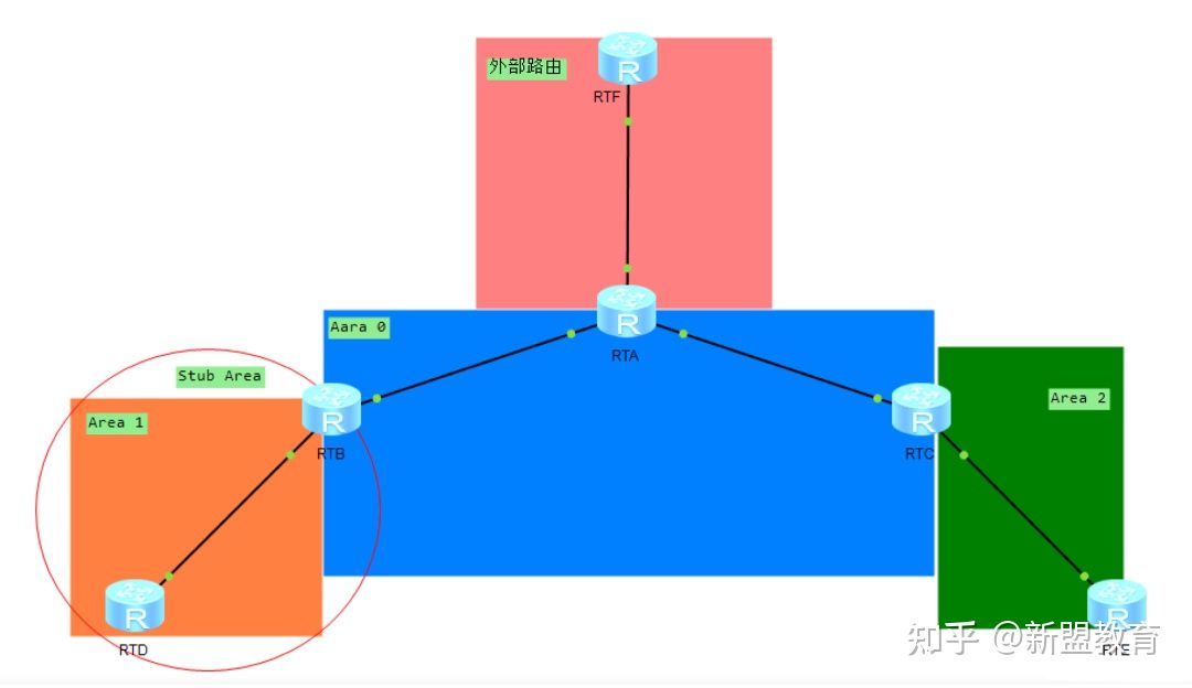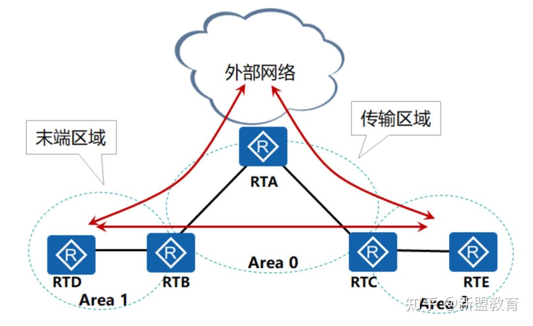 2.末端区域:只承载本区域发起的流量和访问本区域的流量,如Area1、Area 2。