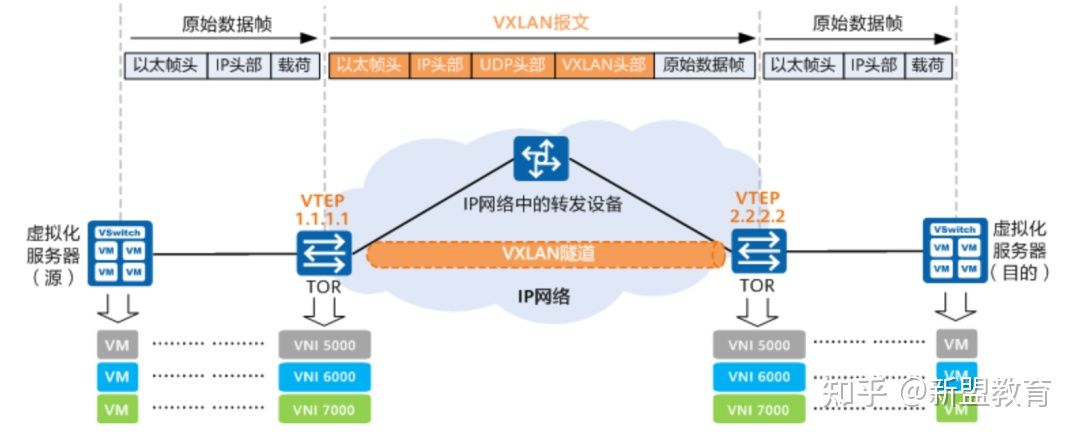 VXLAN在两台TOR交换机之间建立了一条隧道,将服务器发出的原始数据帧加以“包装”,好让原始报文可以在承载网络(比如IP网络)上传输。当到达目的服务器所连接的TOR交换机后,离开VXLAN隧道,并将原始数据帧恢复出来,继续转发给目的服务器。