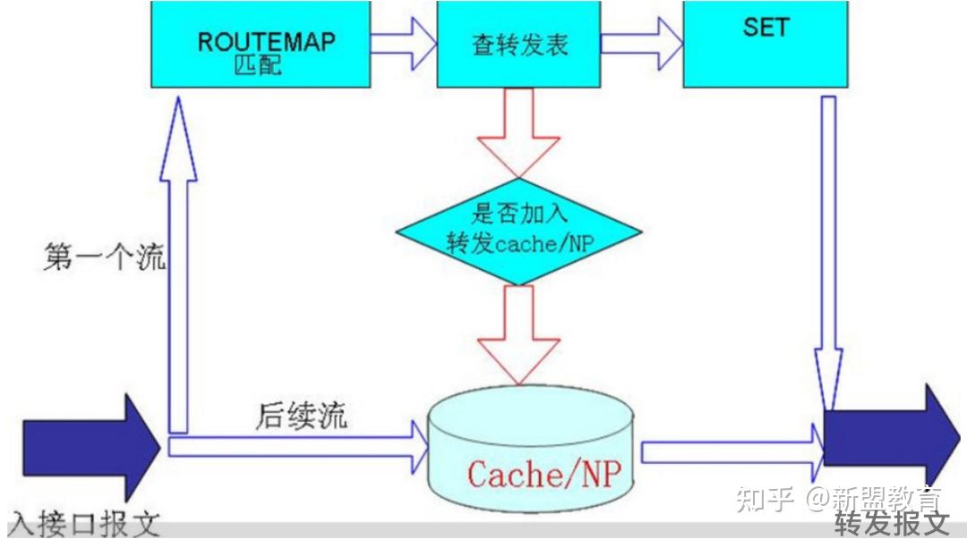 第一个包查路由转发表,如果存在路由,将该路由项以source、dest、tos、入接口等索引放置到cache中,以后同样的流就可以直接查cache。