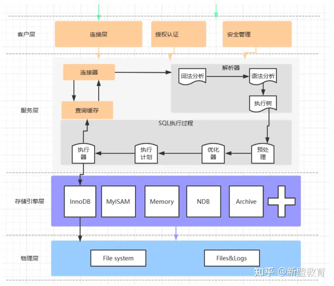 服务层负责与客户层进行连接处理、处理以及执行SQL语句等,主要包含连接器、查询缓存、优化器、执行器、存储引擎。触发器、视图等也在这一层。