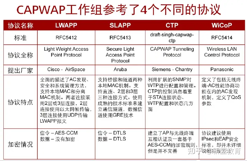 CAPWAP工作组对以上四种通信协议进行评测后,最终采用LWAPP协议作为基础进行扩展,使用DTLS安全技术,加入其他三种协议的有用特性,制定了CAPWAP协议。