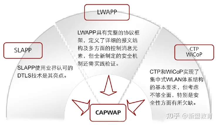 传统的WLAN体系结构已经无法满足大规模组网的需求,因此,IETF成立的CAPWAP(Control And Provisioning of Wireless Access Points 无线接入点的控制和配置协议)工作组,研究打过没WLAN的解决方案。以实现各个厂家控制器与AP间的互通。