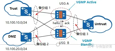 为了保证所有VRRP备份组切换的一致性,在VRRP的基础上进行了扩展,推出了VGMP(VRRP Group Management Protocol)来弥补此局限。
