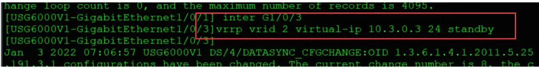 [FW_B] interface GigabitEthernet 0/0/3 [FW_B-GigabitEthernet0/0/3] vrrp vrid 2 virtual-ip 10.3.0.3 standby [FW_B-GigabitEthernet0/0/3] quit
