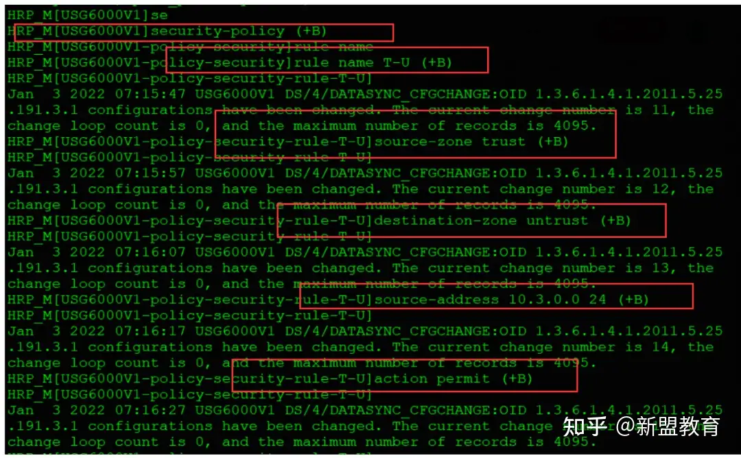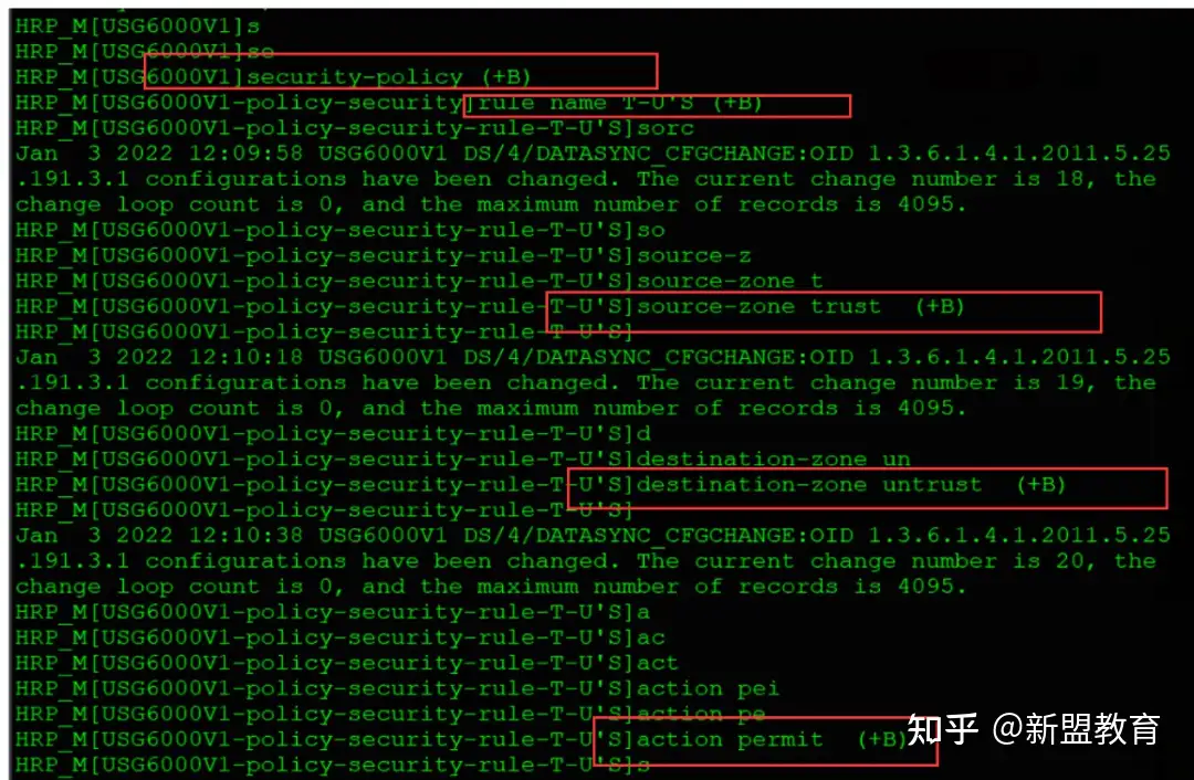 HRP_M[FW_A] security-policy HRP_M[FW_A-policy-security] rule name trust_to_untrust HRP_M[FW_A-policy-security-rule-trust_to_untrust] source-zone trust HRP_M[FW_A-policy-security-rule-trust_to_untrust] destination-zone untrust HRP_M[FW_A-policy-security-rule-trust_to_untrust] source-address 10.3.0.0 24 HRP_M[FW_A-policy-security-rule-trust_to_untrust] action permit HRP_M[FW_A-policy-security-rule-trust_to_untrust] quit HRP_M[FW_A-policy-security] quit