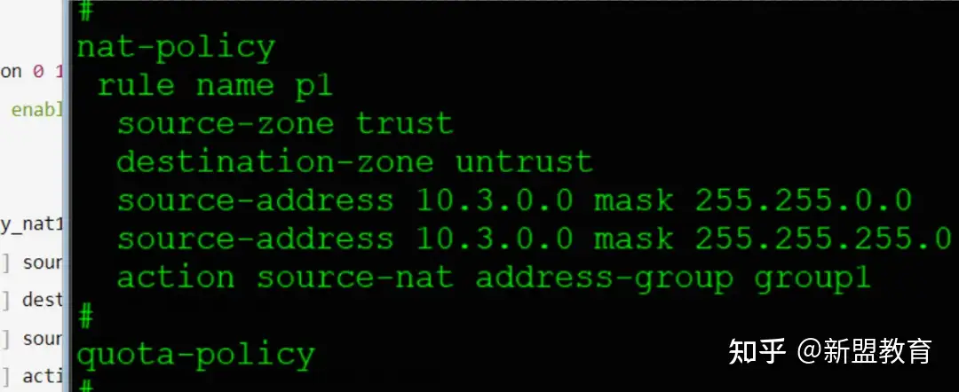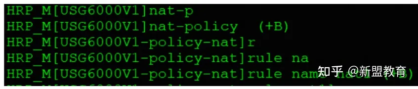 HRP_M[FW_A] nat-policy HRP_M[FW_A-policy-nat] rule name policy_nat1 HRP_M[FW_A-policy-nat-rule-policy_nat1] source-zone trust HRP_M[FW_A-policy-nat-rule-policy_nat1] destination-zone untrust HRP_M[FW_A-policy-nat-rule-policy_nat1] source-address 10.3.0.0 24 HRP_M[FW_A-policy-nat-rule-policy_nat1] action source-nat address-group group1 HRP_M[FW_A-policy-nat-rule-policy_nat1] quit HRP_M[FW_A-policy-nat] quit