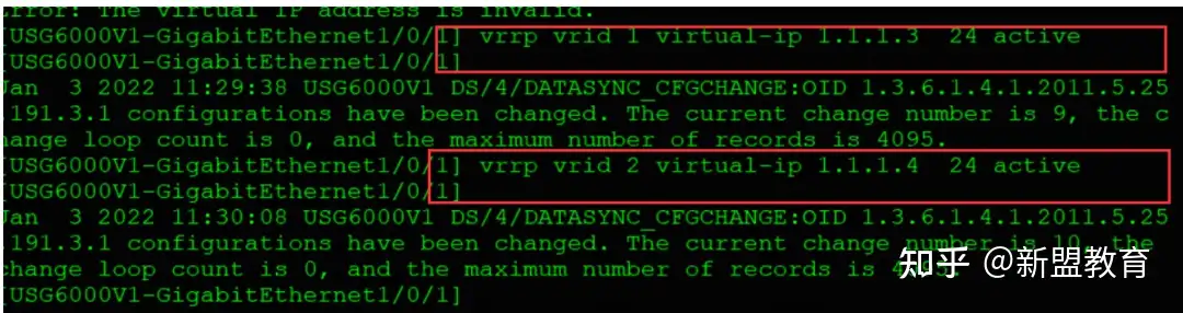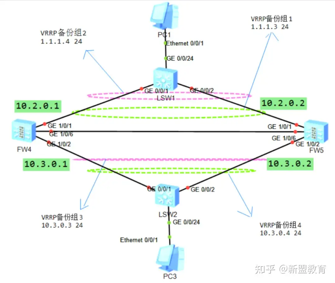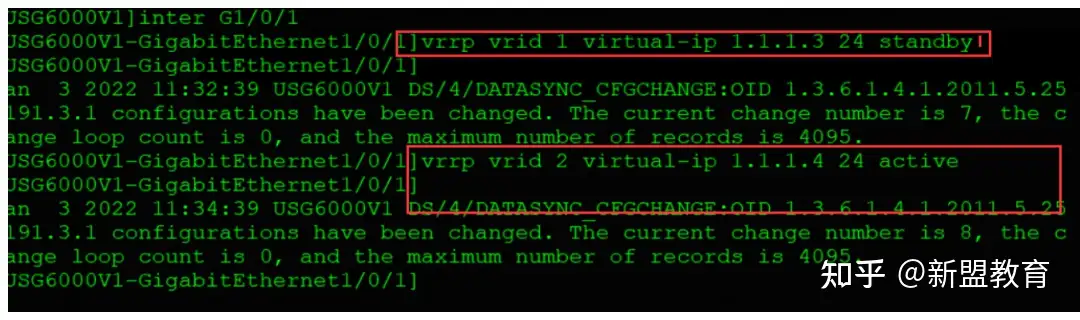 [FW_A] interface GigabitEthernet 1/0/1 [FW_A-GigabitEthernet1/0/1] vrrp vrid 1 virtual-ip 1.1.1.3 24 active [FW_A-GigabitEthernet1/0/1] vrrp vrid 2 virtual-ip 1.1.1.4 24 standby [FW_A-GigabitEthernet1/0/1] quit