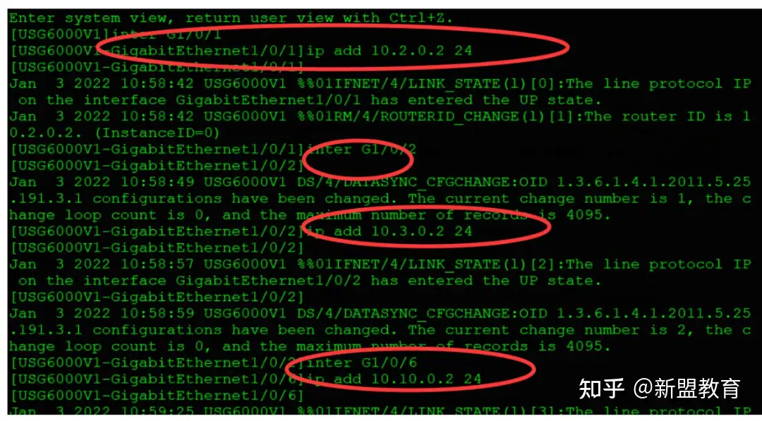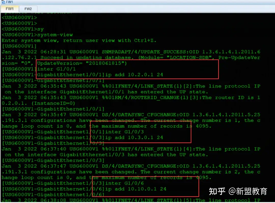 <FW_A> system-view [FW_A] interface GigabitEthernet 1/0/1 [FW_A-GigabitEthernet1/0/1] ip address 10.2.0.1 24 [FW_A-GigabitEthernet1/0/1] quit [FW_A] interface GigabitEthernet 0/0/3 [FW_A-GigabitEthernet1/0/3] ip address 10.3.0.1 24 [FW_A-GigabitEthernet1/0/3] quit [FW_A] interface GigabitEthernet 1/0/6 [FW_A-GigabitEthernet1/0/6] ip address 10.10.0.1 24