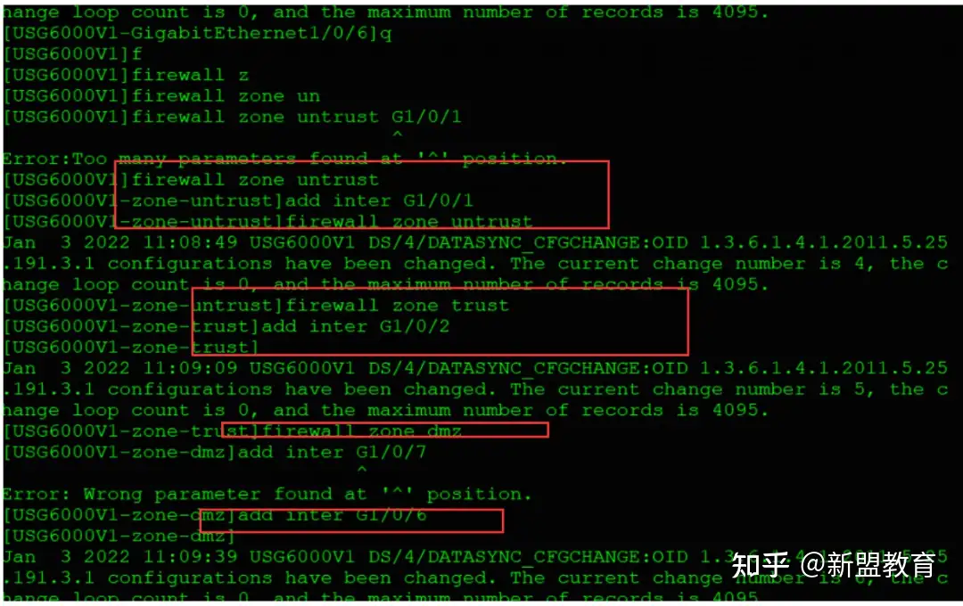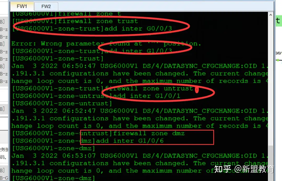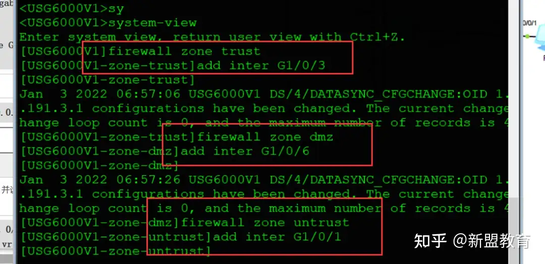 [FW_A] firewall zone untrust [FW_A-zone-untrust] add interface GigabitEthernet 0/0/1 [FW_A-zone-untrust] quit [FW_A] firewall zone trust [FW_A-zone-trust] add interface GigabitEthernet 1/0/3 [FW_A-zone-trust] quit [FW_A] firewall zone dmz [FW_A-zone-dmz] add interface GigabitEthernet 0/0/7 [FW_A-zone-dmz] quit