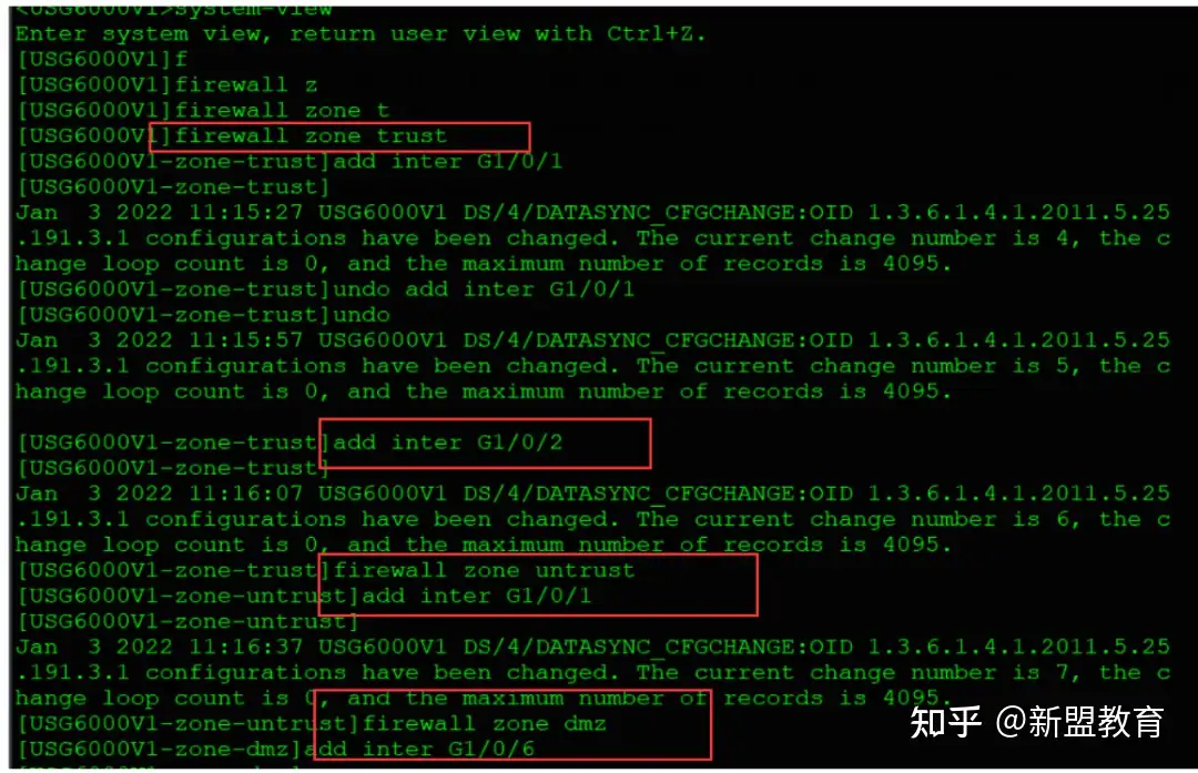 [FW_A] firewall zone trust [FW_A-zone-trust] add interface GigabitEthernet 1/0/3 [FW_A-zone-trust] quit [FW_A] firewall zone dmz [FW_A-zone-dmz] add interface GigabitEthernet 1/0/6 [FW_A-zone-dmz] quit [FW_A] firewall zone untrust [FW_A-zone-untrust] add interface GigabitEthernet 1/0/1 [FW_A-zone-untrust] quit