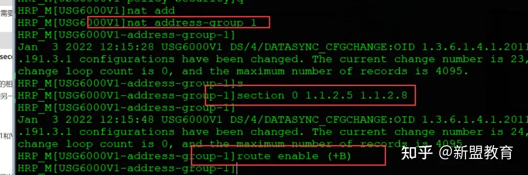 HRP_M[FW_A] nat address-group group1 HRP_M[FW_A-address-group-group1] section 0 1.1.2.5 1.1.2.8 HRP_M[FW_A-address-group-group1] route enable HRP_M[FW_A-address-group-group1] quit