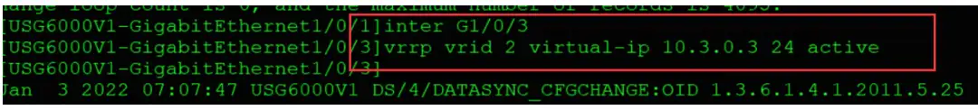 [FW_A] interface GigabitEthernet 0/0/3 [FW_A-GigabitEthernet0/0/3] vrrp vrid 2 virtual-ip 10.3.0.3 active [FW_A-GigabitEthernet0/0/3] quit