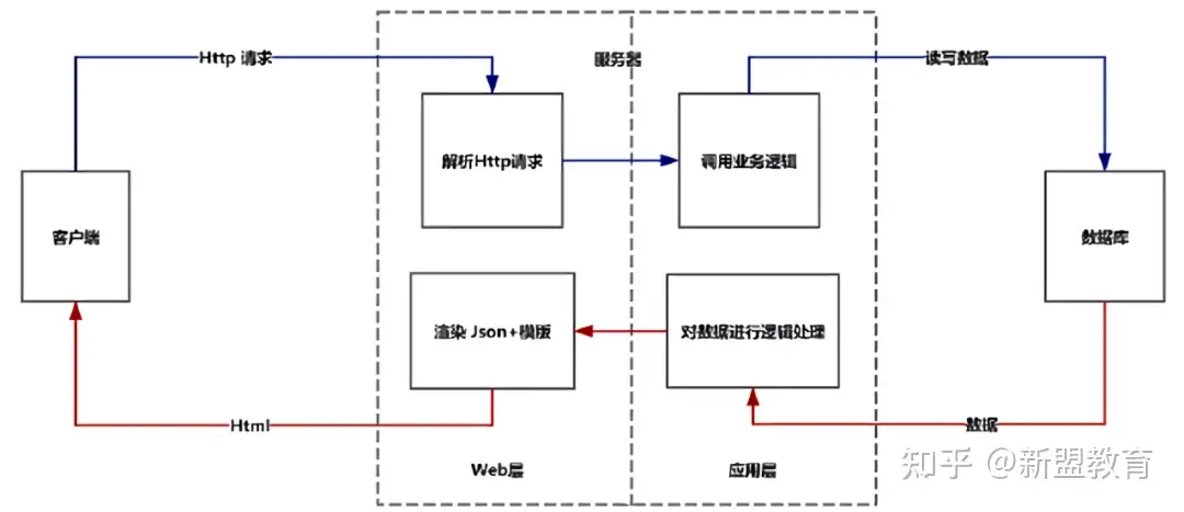 1、客户端向服务器发起Http请求。2、服务器中的web服务层能够处理Http请求。3、服务器中的应用层部分调用业务逻辑,调用业务逻辑上的方法。4、如果有必要,服务器会和数据库进行数据交换. 然后将模版+数据渲染成最终的Html, 返送给客户端。