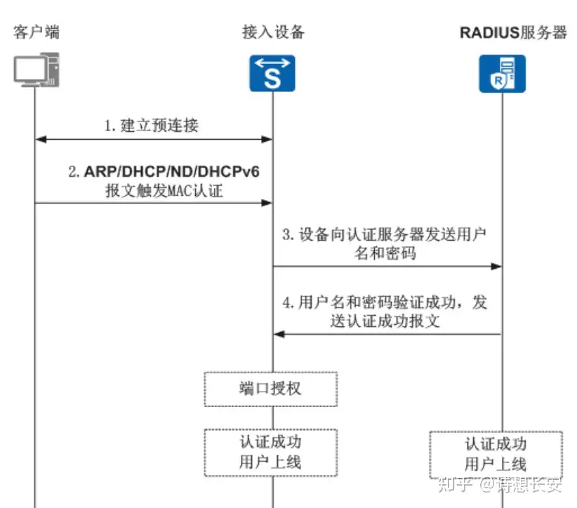 MAC认证,是指终端网络接入控制设备自动获取终端的MAC地址,作为接入网络的凭证发到RADIUS服务器进行校验。