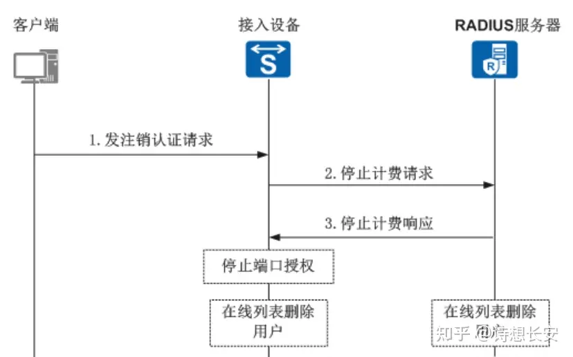 接入设备向RADIUS服务器发送计费停止报文(ACCOUNTING-REQUEST),并停止端口授权,将用户从在线列表中删除。
