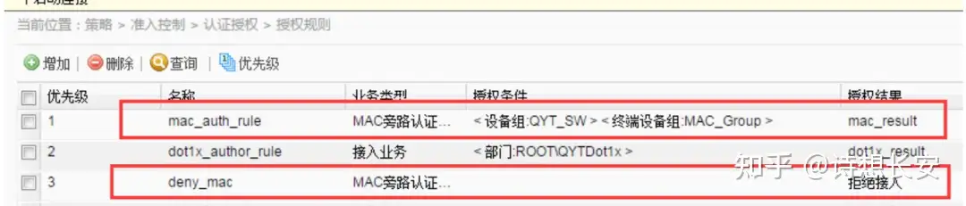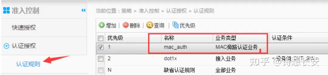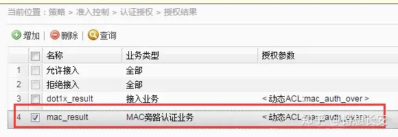 在设置认证规则、授权结果和授权规则,MAC旁路认证和MAC认证对应的业务类型都是MAC旁路业务。