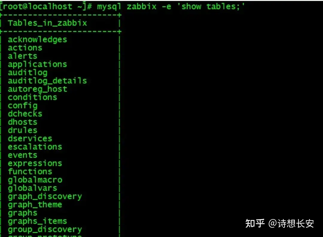 mysql zabbix -e 'show tables;'