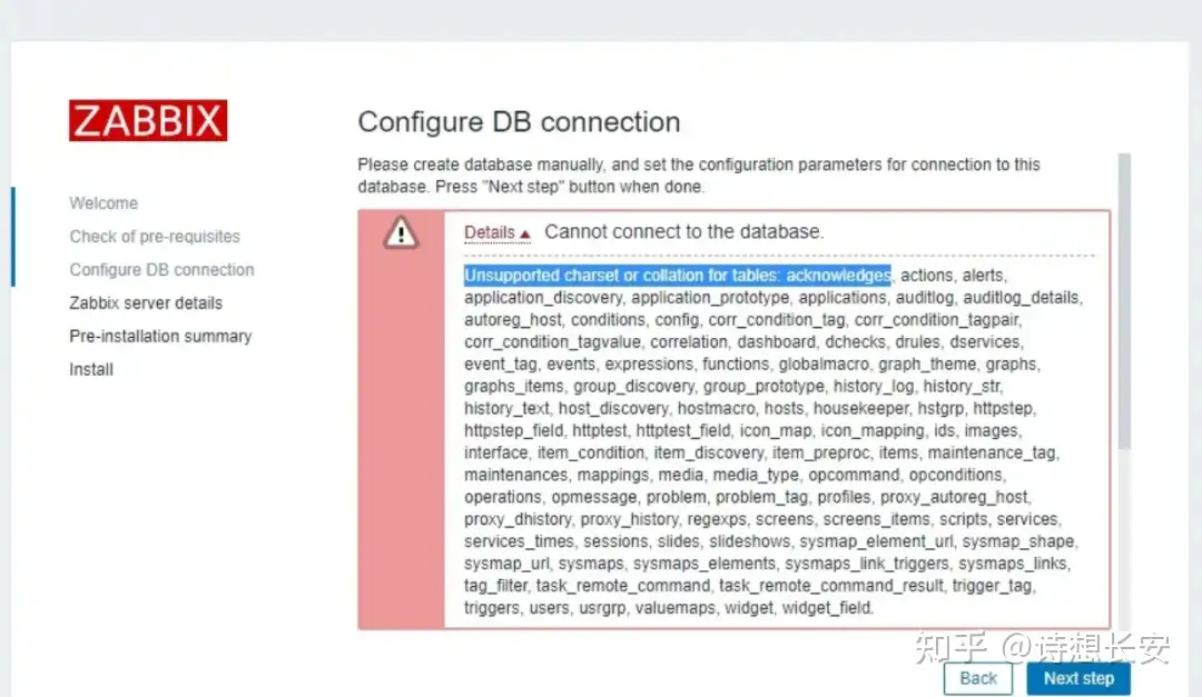Configure DB connection Please create database manually, and set the configuration parameters for connection to this database. Press "Next step" button when done. Unsupported charset or collation for tables: acknowledges