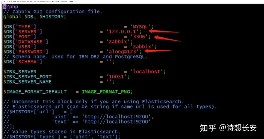 find / -name 'zabbix.conf.php.exampl' 找到所在路径,cd到所在路径下mv zabbix.conf.php.example zabbix.conf.php #重命名文件vim zabbix.conf.php #修改正确的端口、账号及密码 [root@localhost ~]# cd /usr/share/nginx/html/[root@localhost html]# lszabbix.conf.php[root@localhost html]# vim zabbix.conf.php [root@localhost html]#