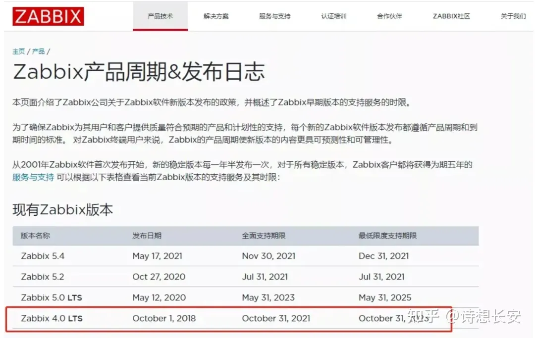 1、到官方网确认版本的服务情况,这里我将选择“zabbix 4.0 LTS”版本。