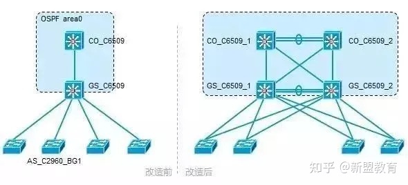 一个网络在改造前,网络结构见“改造前”,可以看得出,网络结构比较简单,而且存在单一设备、单一链路的缺陷。设备和链路均没有冗余。