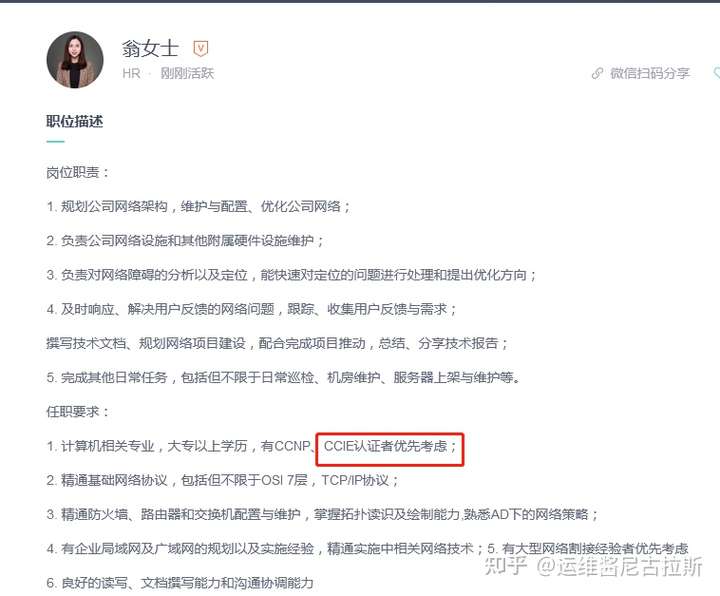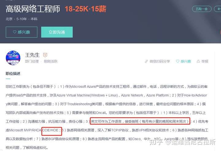 像这家北京的企业是有明确的CCIE需求的,不过有个重点哦需要英语好的,前面忘了跟你说CCIE考试是需要英文的,要是英语不好的还能后悔考HCIE呢,招聘信息上面同样是需要HCIE的,两个的性质都差不多,一个中文考试,一个英文考试。性质虽一样但英文的更难考哦。