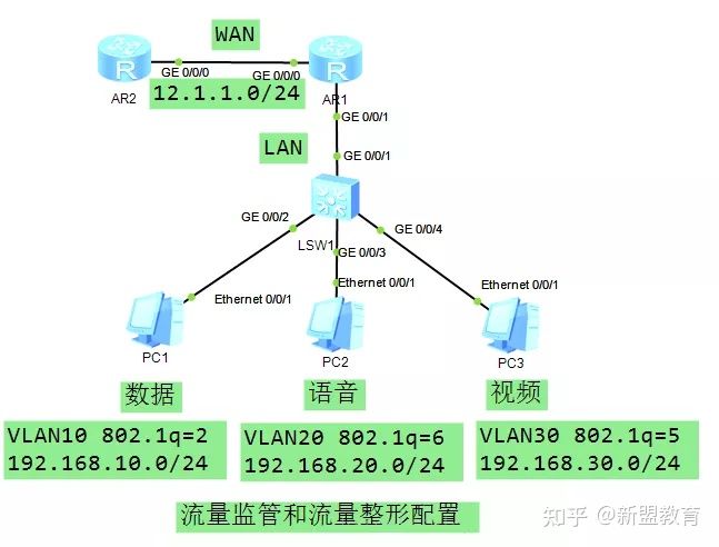 如上图:VLAN10属于数据业务,VLAN20为语音业务,VLAN30为视频业务。在AR1上配置流量监管和流量整形,完成对不同的业务有不同的要求。