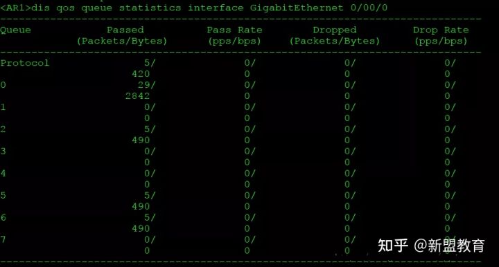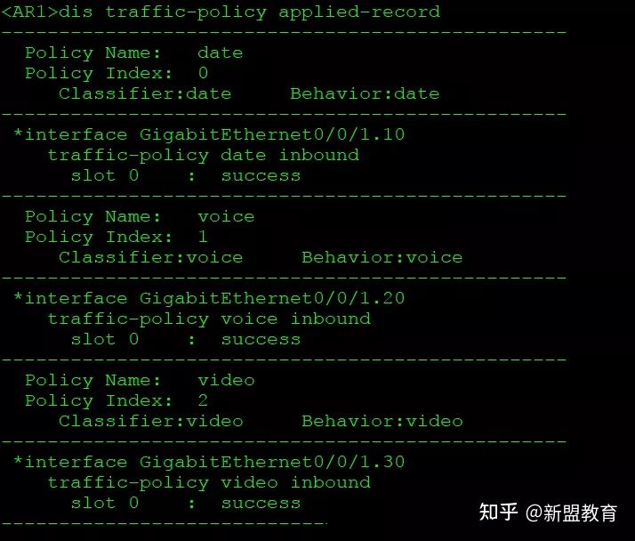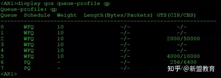 <AR1>dis cur # sysname AR1 # vlan batch 10 20 30 # acl number 2000 rule 5 permit source 192.168.0.0 0.0.255.255 //用来匹配内网网段,做easy IP。 # qos queue-profile qp //基于队列的流量整形 queue 2 gts cir 2000 cbs 50000 queue 5 gts cir 4000 cbs 10000 queue 6 gts cir 256 cbs 6400 schedule wfq 0 to 5 pq 6 to 7 # //流分类,匹配vlan-id traffic classifier video operator or if-match vlan-id 30 traffic classifier date operator or if-match vlan-id 10 traffic classifier voice operator or if-match vlan-id 20 # //流行为,对于流量监管,配置合理的速率。 //对于流量整形,对于匹配到的流标记规定的802.1q优先级 traffic behavior video car cir 4000 cbs 752000 pbs 1252000 green pass yellow pass red discard statistic enable //使能接口的流量统计功能。 remark 8021p 5 //标记优先级为5 traffic behavior date car cir 2000 cbs 376000 pbs 626000 green pass yellow pass red discard statistic enable remark 8021p 2 traffic behavior voice car cir 256 cbs 48128 pbs 80128 green pass yellow pass red discard statistic enable remark 8021p 6 # //流策略,绑定对应的流分类与流行为 traffic policy video classifier video behavior video traffic policy date classifier date behavior date traffic policy voice classifier voice behavior voice # interface GigabitEthernet0/0/0 ip address 12.1.1.1 255.255.255.0 qos queue-profile qp //在接口应用队列模板 qos gts cir 8000 cbs 200000 //将端口速率限制在8000kbit/s. nat outbound 2000 //做nat,easy ip # interface GigabitEthernet0/0/1 trust 8021p //接口信任802.1q优先级 qos car inbound cir 10000 cbs 1880000 pbs 3130000 green pass yellow pass red discard //配置入口的速率限制在10000kbit/s. # interface GigabitEthernet0/0/1.10 dot1q termination vid 10 //配置子接口Dot1q终结的单层VLAN ID。 ip address 192.168.10.254 255.255.255.0 traffic-policy date inbound //应用流策略 arp broadcast enable //使能终结子接口的ARP广播功能。 # interface GigabitEthernet0/0/1.20 dot1q termination vid 20 ip address 192.168.20.254 255.255.255.0 traffic-policy voice inbound arp broadcast enable # interface GigabitEthernet0/0/1.30 dot1q termination vid 30 ip address 192.168.30.254 255.255.255.0 traffic-policy video inbound arp broadcast enable # ip route-static 0.0.0.0 0.0.0.0 12.1.1.2 //出外网的默认路由 # return